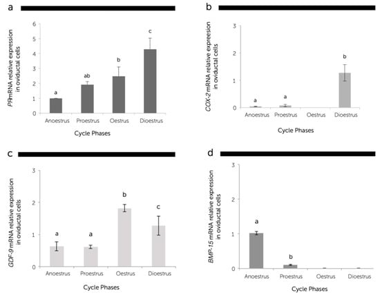 The real-time RT-qPCR was performed using oviduct cell samples from each collected pool and phase of the oestrous cycle to determine the mRNA levels of PR, COX-2, BMP-15, and GDF-9.