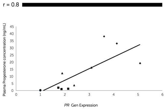 Pearson’s correlation coefficient between the relative expression of the progesterone receptor (PR) messenger RNA (mRNA) in canine oviductal cells and the concentration of progesterone in plasma samples obtained in anoestrus (●) (the values in anoestrus were almost the same, thus the points are overlapped); proestrus (■); oestrus (▲) and dioestrus (◆) phases. (P < 0.05).