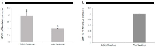 The comparison of GDF-9 and BMP-15 gene expression before and after ovulation were assessed using the Student t-test.