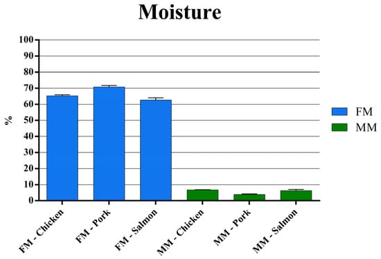 Water content in chicken, pork, and salmon fresh meat (FM) and meat meal (MM). Data are reported as mean ± SEM, n = 10.