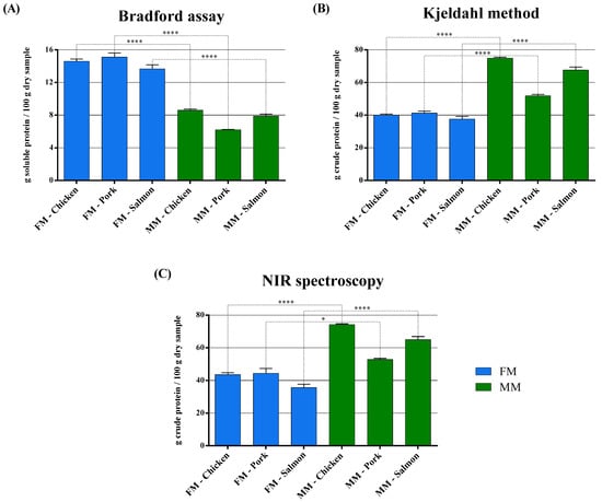 (A) The soluble protein content of chicken, pork, and salmon FM and MM determined by the Bradford assay. (B) The crude protein content of chicken, pork, and salmon FM and MM determined by the Kjeldahl method. (C) The crude protein content of chicken, pork, and salmon FM and MM determined by NIR spectroscopy. Data are reported as mean ± SEM, n = 10. * p < 0.05, **** p < 0.0001.