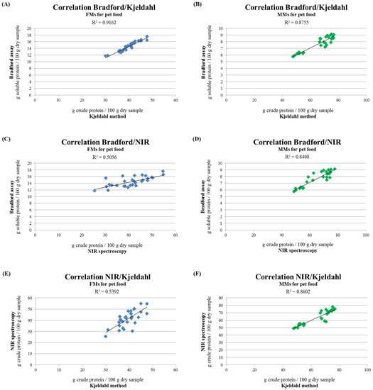 On the contrary, no strong correlations are found neither between the Bradford assay and NIR spectroscopy (R2 = 0.5056) nor between NIR spectroscopy and the Kjeldahl method (R2 = 0.5392) for all the FMs analyzed (Figure 3C,E), while a better correlation has been found for MMs (Figure 3D,F) R2 = 0.8408 and R2 = 0.8602, respectively. The ratio between the Bradford assay and NIR spectroscopy, as far as MMs are concerned, corresponds to a factor of 0.12, while for the NIR/Kjeldahl comparison, the ratio is 0.99.
