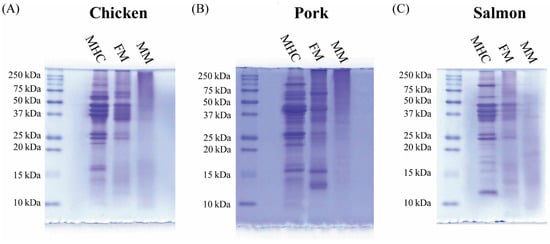 Protein profile of meat for human consumption (MHC), FM, and MM of chicken (A), pork (B), and salmon (C) evaluated by SDS-PAGE, followed by Coomassie Blue staining method.