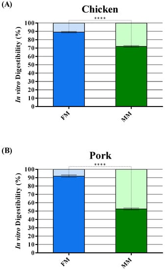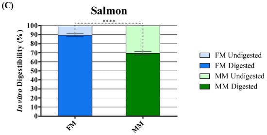 Digestibility of chicken (A), pork (B), and salmon (C) FM and MM analyzed with in vitro digestibility assay. Data are reported as mean ± SEM, n = 10. **** p < 0.0001.