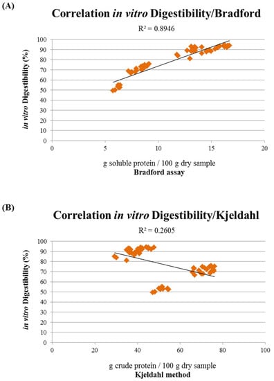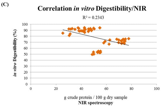 The obtained values of digestibility were then correlated with the values of the Bradford assay, highlighting a linear correlation (R2 = 0.8946) between the soluble protein content and the digestibility of the raw materials used for the production of dry pet food (Figure 6A). The digestibility of the different ingredients was also compared with the Kjeldahl method and NIR spectroscopy; however, the results show how there is a weak inverse correlation between the crude protein content and the digestibility (Figure 6B,C).