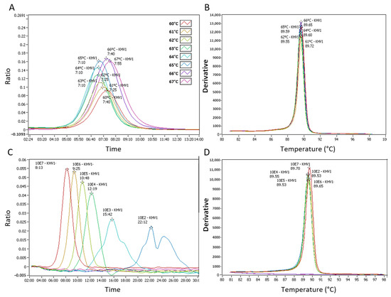 Cyprinid herpesvirus (CyHV)-3 loop-mediated isothermal amplification (LAMP) assay, test named KHV1. (A) Isothermal amplification of CyHV-3 DNA at different reactable temperatures from 60 °C to 67 °C. (B) Anneal derivative of the isothermal amplified products in the LAMP reaction showed in “A”. (C) Analytical sensitivity of CyHV-3 LAMP assay. The amplification graph shows serial dilutions from 107 to 1 copy of a recombinant plasmid. (D) Anneal derivative of the isothermal amplified products in the LAMP reaction showed in “C”.