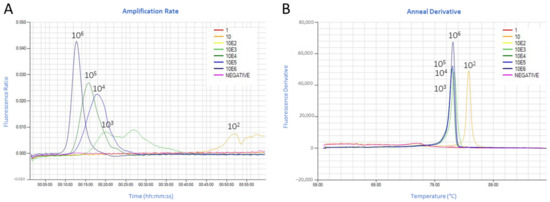 Carp edema virus (CEV) loop-mediated isothermal amplification (LAMP) assay. (A) Analytical sensitivity of CEV LAMP assay. The amplification graph shows serial dilutions from 106 to 1 copy of a recombinant plasmid. (B) Anneal derivative of the isothermal amplified products in the LAMP reaction.