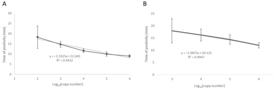 For both tests, linear regression analysis between the detected copy numbers and the Tp showed a good correlation (Pearson’s r = −0.97 and −0.96 for CyHV-3 and CEV LAMP assays, respectively) (Figure 4).