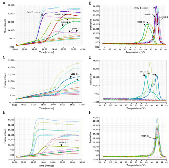 A further 119 samples were tested; 30 corresponded to a CyHV-3 variant, 28 were positive for CyHV-1, 10 were CyHV-2, 2 were AngHV, there were two uncharacterized herpesvirus (HV), and the last 47 samples corresponded to an uninfected fish. The LAMP test did not cross-react with samples from the population harboring the CyHV-3 variant DNA. However, the concentration of the CyHV-3 variant in this population was low (only detected by the generic CyHV nested-PCR). Of the 28 CyHV-1 samples, three of them gave a LAMP amplification. Of those amplifications, two samples showed a non-specific LAMP product with a melting temperature different from the predicted for CyHV-3 (M068 2.1). While the third sample (M065 2.1), a CyHV 1-like showing a 98% homology to carp pox virus in the polymerase gene, one of the duplicate gave a LAMP product which a melting temperature not discernable from CyHV-3 (false positive) (Figure 5). Of the 10 goldfish herpesvirus (CyHV-2) samples, three of them resulted in amplification in the CyHV-3 LAMP assay (Figure 5). Of those amplifications, a sample (L112 2.1, Figure 5C,D) showed a second peak in the range of CyHV-3 melting temperature for one of the duplicates. This sample tested positive for CyHV-3 by Taqman qPCR at a very low copy number; thus, the test was interpreted as correct. One of the duplicates of the CyHV-2 sample from goldfish (M084-2.2, Figure 5E,F) also showed LAMP amplification of low intensity, but the melt analysis cannot distinguish the product from CyHV-3. Another CyHV-2 sample (M084-2.1, Figure 5A,B) also gave a LAMP product in both duplicates within the CyHV-3 melting temperature.