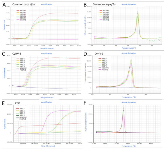 Examples of the detection of the common carp elongation factor 1a (ef1a) gene (A,B), the Cyprinid herpesvirus (CyHV)-3 (C,D), and the carp edema virus (CEV) (E,F) by loop-mediated isothermal amplification (LAMP) tests in common carp mucus swabs taken during disease investigations. (A,C,E) The amplification graph of tested swabs. (B,D,F) The anneal derivative graph of the corresponding LAMP products.
