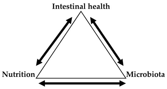 As shown in Figure 1, there is a close bidirectional relationship between intestinal health-nutrition, and intestinal health-microbiota. Intestinal health affects the efficiency with which the nutrients are absorbed having direct effects that may affect several systemic functions [96]. On the other side, the quality of feedstuffs and/or nutrients being provided determine digestibility and subsequent partitioning of digested nutrients among different tissues (including intestines) and the overall health of the animal. For instance, feeds high in viscous fibers increase the mucus secretions reducing the nutrient digestibility (metabolizable energy, protein) that is what we call “poor digestibility” [97]. The interrelationship between intestinal health and microbiota is noted by the fact that fully stablished microbiota in older animals makes them more resistant to disturbances compared to younger animals [86]. Awad et al., [98], reported that birds younger than two weeks had more Proteobacteria (increase pro-inflammatory cytokines), whereas Firmicutes and Tenericutes (increase anti-inflammatory cytokines) dominated in birds older than two weeks. Nutrition and microbiota share a very tight interrelationship with each other. With the removal of antibiotics, we have realized that we are not only feeding the animal, but the gut as well. In this way indigested fibers and other nutrients can be used by harmful bacteria that causes dysbiosis or by commensal bacteria that can yield short-chain fatty acids (SCFA) that are utilized by the animal [99] and some of them (i.e., butyrate) are associated to intestinal health [100]. Therefore, at the end, the type of fiber (solubility and fermentability) determines the type of bacteria that dominates the gut and the immune response the host will activate in response to such changes.