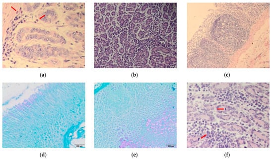 Histopathological sections of sheep abomasa infected with Haemonchus contortus: (a) section stained by haematoxylin and eosin (HE) (400×) showing infiltration with eosinophils (red arrows) in unsupplemented lambs (UNS); (b) section stained by HE (200×) showing strong inflammation in the mucosal membranes in lambs supplemented with a mixture of A. absinthium stems and M. sylvestris flowers (ARTMAL); (c) section stained by HE (100×) showing formation of lymphoid nodules in the mucous membrane in lambs supplemented with M. sylvestris flowers (MAL); (d) section stained by Periodic acid-Shiff (PAS) (40×) showing mucus formation (pink color) in the superficial part of the mucosal membrane in UNS; (e) section stained by PAS (40×) showing mucus formation (pink color) in all layers of the mucosal membrane and distention of superficial parts of glands in lambs supplemented with A. absinthium stems (ART); and (f) section stained by HE (200×) showing moderate mitotic activity of the epithelial cells (red arrows) and inflammatory infiltrate with mononuclear cells in ART.