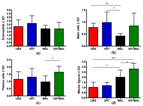 Mean numbers of different immune cells and mitotic figures in the abomasa of lambs infected with Haemonchus contortus fed with different diets (* p < 0.05; ** p < 0.01; *** p < 0.001): (a) mean numbers of eosinophils; (b) mean numbers of mast cells; (c) mean numbers of plasma cells; and (d) mean numbers of mitotic figures. UNS: unsupplemented lambs; ART: lambs supplemented with A. absinthium stems; MAL: lambs supplemented with M. sylvestris flowers; ARTMAL: lambs supplemented with a mixture of A. absinthium stems and M. sylvestris flowers.