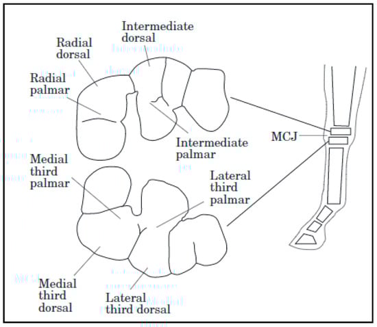 Common sites of cartilage sampling in the carpal joint [43]. Due to the uneven topography of the joint, some sites are predisposed to lesions and alterations to macromolecular characteristics such as collagen and DNA content. Middle Carpal Joint (MCJ).