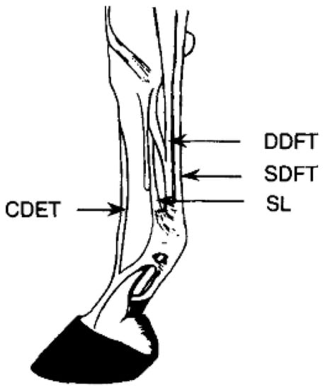 Anatomy of forelimb tendons frequently studied [51]: common digital extensor tendon (CDET), deep digital flexor tendon (DDFT), superficial digital flexor tendon (SDFT), and suspensory ligament (SL).