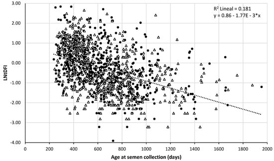 In the boar population of our study, tDFI ranged from 0.018 to 20.1% (LNtDFI: −4 to 3). The big number of randomly chosen ejaculates analyzed in the present study explains the bigger range of tDFI in comparison to other authors [27]. Didion et al. (2009) [7] proposed that boar spermatozoa with greater than 6% DFI might negatively affect both the farrowing rate and total piglets born. This threshold would correspond in our figure with LNtDFI values above 1.8 in which most of the boars are aged below 2 years. This result agrees with the timeline of the maturation of boar testicles described by Knecht et al., 2017 [31]. In addition, Boe-Hansen et al. (2008) [33] reported that the total number of piglets born for Hampshire, Landrace and Danish Large White boars was, respectively, 0.5, 0.7 and 0.9 piglets less per litter when the % tDFI values were above 2.1%. This cut-off would coincide approximately in Figure 1 with the LNtDFI of 1, above which most of the boars had in any case less than 2 years old.