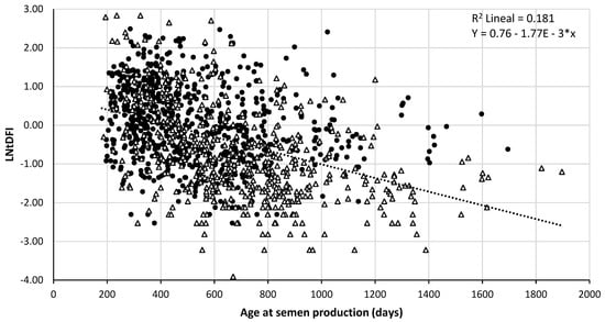 Relationship between sperm nuclear DNA fragmentation index and age of the boar at the collection of the ejaculate. Fragmentation is expressed as the LNtDFI and age of the boar is expressed in days. Data are represented according to its classification in increasing (⬤) or decreasing (△) photoperiod.