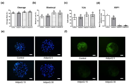 In the first experiment, we found that 15 and 30 μg/mL adiponectin supplementation significantly increased cleavage rates, blastocyst rates, and TCN of parthenogenetic embryos. Moreover, there were no significant differences between 15 and 30 μg/mL adiponectin treatment during IVC. Concomitantly, these treatment groups significantly reduced the expression level of XBP1 compared to the control and 5 μg/mL adiponectin groups (p < 0.05). We demonstrated that treatment with 15 and 30 μg/mL adiponectin significantly improved cleavage rate, blastocyst rate, and TCN of blastocysts compared to the control and 5 μg/mL adiponectin groups (p < 0.05). These results implied that 15 μg/mL adiponectin treatment during IVC was sufficient to enhance in vitro embryo development. The results were similar between 15 and 30 μg/mL adiponectin treatment, with no significant difference among the groups (p > 0.05). In addition, a previous study reported that 30 μg/mL adiponectin improved oocyte maturation rate and blastocyst formation rates in porcine oocytes [21]. Even though 30 μg/mL is the upper limit of physiological concentration [11,56], investigation on higher concentrations of adiponectin treatment could provide further insight regarding the evaluation of the effects of adiponectin on in vitro embryo development.
