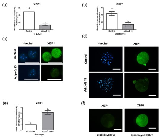 Effect of 15 μg/mL adiponectin supplementation during in vitro culture of somatic cell nuclear transfer (SCNT) embryos on the protein expression of XBP1 in ≥4-cell embryos on day-2 (a) and in blastocysts (b); Hoechst (blue) and immunofluorescence (green) staining of control and adiponectin-treated ≥4-cell embryos (scale bars 200 μm) (c) and blastocysts (scale bars 100 μm) (d). Comparison of XBP1 expression in the blastocyst stage derived from parthenogenetic activation and SCNT (scale bars 100 μm) (e,f). At least 24 embryos per group from 4 biological replicates were analyzed in each experiment. Data are expressed as mean ± SD. a,b Values with letters indicate significant difference (p < 0.05). The experiment was performed as at least three independent replicates. AdipoQ 15 = adiponectin 15 μg/mL.