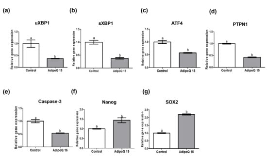 Relative expression levels of unfolded protein response-related mRNAs (uXBP1, sXBP1, ATF4, PTPN1), Caspase-3, Nanog, and SOX2 in ≥4-cell embryos (day 2) derived from somatic cell nuclear transfer embryos (a–g). Data are expressed as mean standard deviation (±SD). Within each category, a,b groups marked with different letters are significantly different (p < 0.05). The experiment was replicated three times. AdipoQ 15 = adiponectin 15 μg/mL.