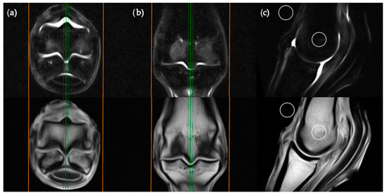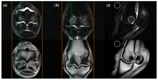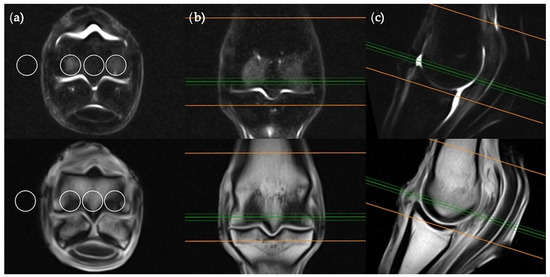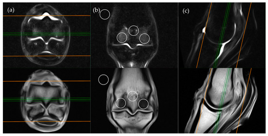 STIR FSE (top row) and T1W GRE (bottom row) MRI images in (a) transverse; (b) frontal and (c) sagittal planes; demonstrating the location of condylar ROI placement in a parasagittal plane. The green lines on the transverse and frontal images show the standardized orientation and location of the medial or lateral condylar parasagittal slices for ROI placement. The orange lines show the extent and orientation of all the sagittal slices acquired in the MRI study.