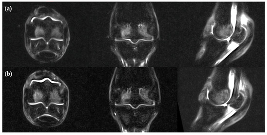 STIR FSE MR images in transverse, frontal and sagittal planes of the same cadaver limb (a) after and (b) before a freeze-thaw process.