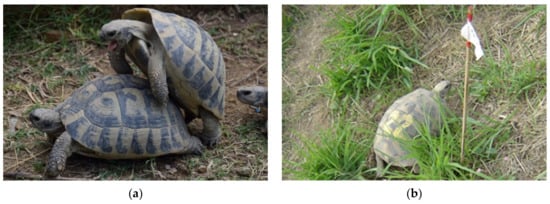 Mating season. (a) The mating season for Testudo hermanni boettgeri typically lasts from April to mid-July and depends on climatic conditions. (b) The breeder marks the nest with a flag to make it easier to collect eggs.