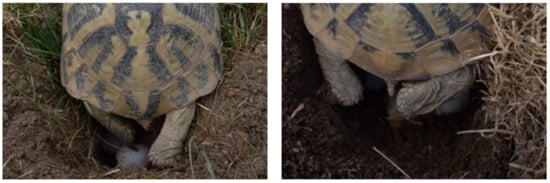 Hermann’s tortoises are active from March until the end of October, and their nesting activities peak during March–April and August–September []. The minimum size of the plastron is approximately 120 mm for sexually active males and 130 mm for females. Tortoises are promiscuous in their mating habits, and there is no evidence of mate selection in relation to size. In the nature, nesting site selection correlates with ground temperature, and nesting itself occurs mainly in the early evening before nightfall when ground temperature characteristics are most indicative of the relative temperature at a given site [].