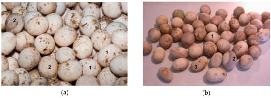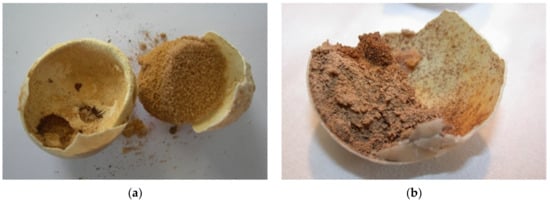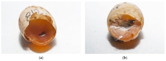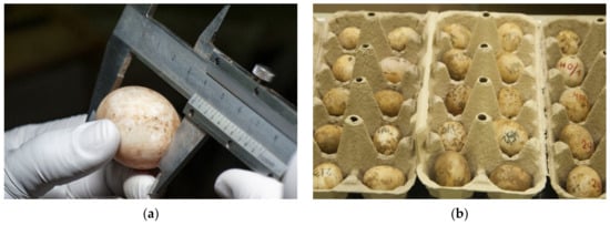 Important critical points for successful hatching are also weight of eggs, their shape and thickness of shell. Typically, individual tortoises give eggs of similar size value or shape. Differences may be due to unbalanced meals and/or health problems (e.g., metabolic diseases, ovarian or oviduct infections, other reproductive difficulties, problems in young hatching tortoises). Differences also depend on the species []. Mechanical damage or cracking of the shell can happen at the time of tortoise laying (Figure 12).