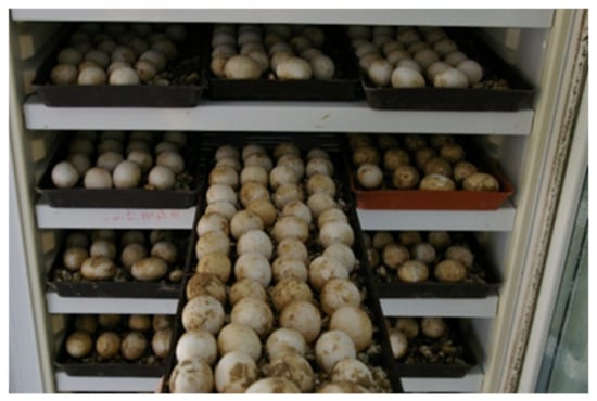 During the collection period and throughout the hatching process, the eggs must remain in the same position in which they were collected. There are large differences in the collection of poultry and tortoise eggs. Within a few hours after oviposition, reptile embryos rise to the top of the egg and start adhering to the inner membrane of the shell. If the egg is turned after the embryo has attached itself, the weight of the yolk could impede normal development or tear both the vitelline and extra-embryonic membranes, leading to death or malformations []. One of the reasons why reptile eggs are sensitive to movement around their horizontal axis during development is the absence of chalaza []. Aubert et al., 2015 [] found that post-birth mortality in snakes was significantly higher in turned compared to unturned embryos. They suggest that eggs should not be moved from their natural position. Tortoise egg collections are very important part of a successful hatching (Figure 3b). Within six hours, the eggs are inserted in the disinfected incubators. Antiseptic solution F10 SC is used for fumigation (Figure 4).