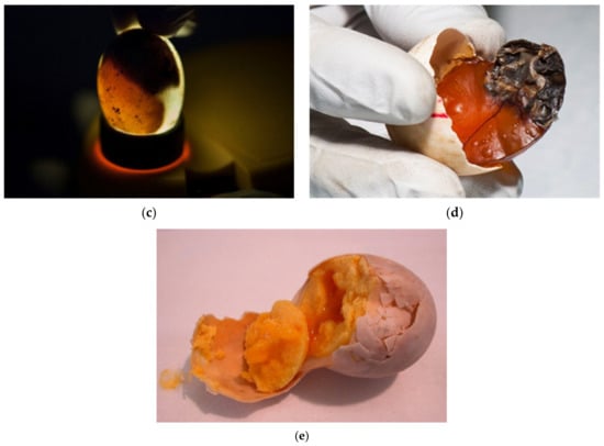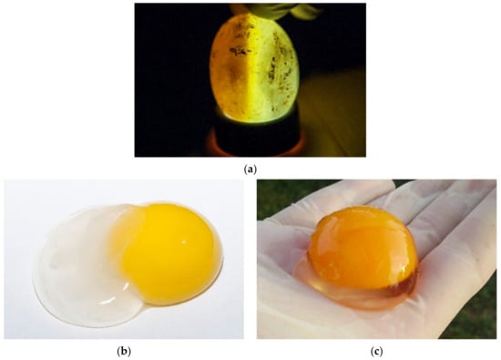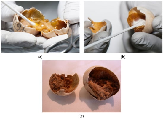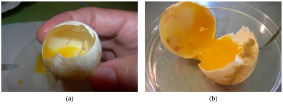 During incubation eggs can be examined with candling [,] (Figure 5a). The white of a fresh egg is cloudy and very thick (Figure 5b). As the egg ages, the white becomes almost transparent and thin as air passes through the pores in the eggshell (Figure 5c). Each yolk is covered with a thin transparent membrane that prevents the yolk from breaking. This membrane becomes increasingly thinner as an egg ages, so fresh yolks stand taller and are less likely to break. As an egg ages, the yolk absorbs water from the albumen. The evaluation of the basic composition, amino acid and fatty acid profiles and the presence of certain trace elements in T. h. boettgeri eggs has already been mentioned by Stvarnik et al. [].