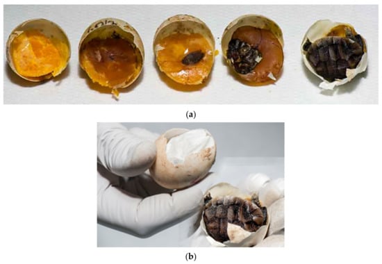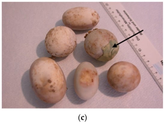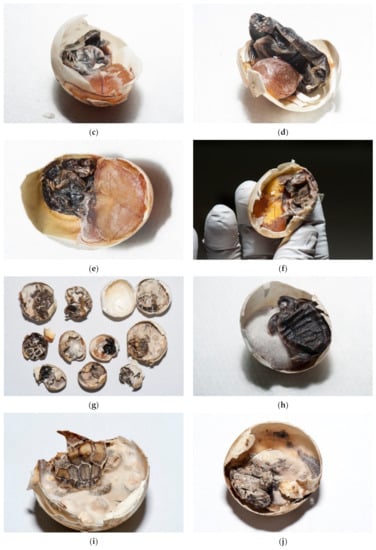 Humidity and temperature are important factors for proper embryonic development and hatching. At high levels of desiccation, embryonic mortality increases. Mortality appears later in incubation when water stores decline below some critical value. The limiting value is likely one that compromises either tissue osmotic concentration and/or potentially blood flow in the cardiovascular system. Analyses of embryo and yolk mass indicate that desiccation results in a decreased ability to use yolk to produce tissue mass []. In our study desiccated eggs in various stages were confirmed in 19.1% (Figure 8a,b).