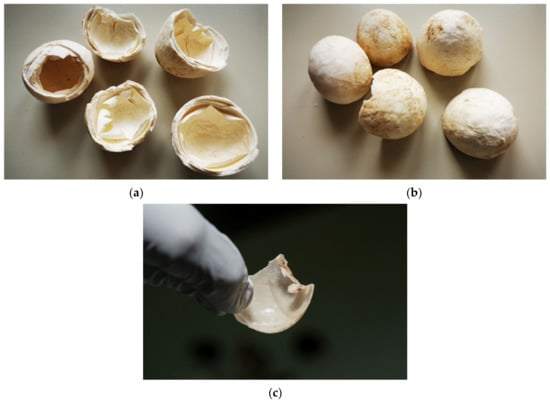 The reason could be due to cracked eggs and poor egg manipulation. The improper nutrition of the breeding parents and reproductive diseases of the females (e.g., inflammation of the oviduct) can also be the reason (Figure 9a,b). Cracked or thinner eggshell were noted at T. h. boettgeri (Figure 9c). Some previous studies have shown that artificial incubation of small eggs from Testudo hermanni is not successful [,]. Based on this fact, we changed the protocol for T. h. boettgeri in our farm. Eggs weighing less than 10 g are no longer hatched. The possible reason could be faster desiccation of small eggs. Mummification of tortoise embryos has not been described as a problem during incubation, but it seems to be a very important fact in our study. In the future, it will be necessary to carefully study the factors affecting humidity and resulting drying of eggs/embryos on the farm (Figure 10a–j). In our study, 0.73% of eggs were unfertilized, desiccated, and moldy at the same time (Figure 11a–c). Because of the previously mentioned reasons, the occurrence of desiccated eggs indicates obligatory control of humidity and temperature in the incubator.