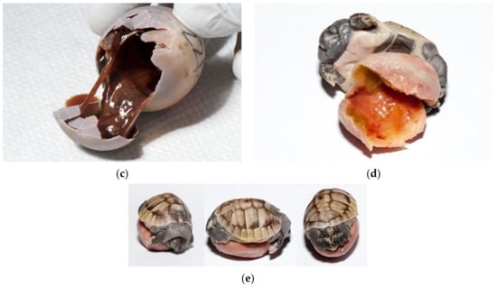 Infestation in different development stages. (a) This egg was unfertilized and infected at the same time; (b) Infected embryo from 1.0 cm to 1.5 cm (group 2) in which yolk content was desiccated. (c) Completely destroyed egg, autolysis due to post-mortem changes and unknown pathogens were found. (d,e) Tortoise with oedema of the neck and other parts of the body with infected yolk sacks.