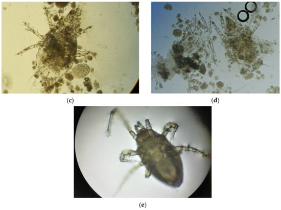 Infestation with mites. (a,b) Infestation of eggs causing destruction of egg contents. (c) An adult female with egg. (d) Two adults (male and female) and a larva. (e) A Mesostigmata mites. Images (c–e) are obtained at 100× magnification.