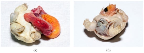 Among the embryos at different sizes, we found desiccated and/or moldy embryos, infected embryos, deformed embryos including twins, and also live embryos. At the beginning of development, when the vessels were not always seen or when the eggs were infected and the changes were too extensive the estimating of fertilization could be unreliable (Figure 13a,b). Occasionally, during ovulation a blood vessel in the stroma ruptures and bleeds onto the surface of the follicle. The blood spot remains even if the embryo dies before obvious development of embryonic blood islands. When the egg is opened at the end of incubation, ovarian blood spots may be confused with embryonic blood islands []. In these mentioned cases, we could not accurately determine fertility of eggs. When we look for the presence of an embryo, it helps to look at the surface of the yolk sack on which the embryo floats in all stages of development.