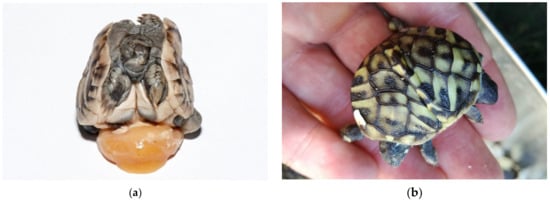 Among deformed embryos, severe deformation of the shell, umbilical hernia, and depigmentation were found. Tortoises without eyes, nares and mouth, tortoises with one eye (cyclops) also occurred, and an infected yolk sack was present in most of them. We noted depigmentation of skin and shell in all deformed embryos except in twins. Malformed carapaces and missing tails were found in 0.92% hatched tortoises. These babies were not a part of egg failure study but are still important for hatching conditions improvement. They hatched by themselves and mostly died in a few months. In some cases, the shells were covered with mold (Figure 19a,b).