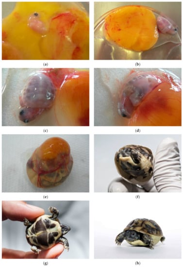 There are no data about development, deformed embryos and twins for Testudo species. In our study, dead and alive deformed embryos were detected in 0.48% (Figure 17a–h) and twins in 0.11% (cephalopagus, parapagus, thoracopagus, omphalopagus) (Figure 18a,b).