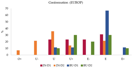 Figure 1 and Figure 2 show the percentage distribution of the carcasses in each category of conformation and degree of fatness according to the four groups in study. Graphics show that there were differences in the distribution of the foal carcasses among the various conformation and degree of fatness classes. In particular, 67% of BU-D1, 31% of JN-D1, and 30% of BU-D2 foals were scored in category E, whereas 36% of JN-D2 were classified in category U. Concurrently, 78% of BU-D1 were over-finished and included in category 5 (very high fat cover), 40% of BU-D2 foals were scored in category 4 (abundant fat cover) and 38% of JN-D1 group was classified in the slightly minor class 4-. On the other hand, 21% of JN-D2 foals were equally scored in categories 3+, 4, and 4+. Thus, looking at the groups, BU-D1 foals obtained the highest scores both for conformation and adiposity degree, while JN-D2 ones recorded the lowest values. These results agreed with the aforementioned results about productive variables, where BU-D1 foals reported the highest LWS, carcass measurements, and FT values among the four groups. On the whole, all groups obtained good conformation and adiposity scores with a good muscular development and abundant fat cover. Again, our values cannot be easily compared with data obtained from other studies; in this case, mainly because a broader conformation scale [42] was used compared with previous studies. In addition, different values were obtained by Sarriés et al. [12], who found smaller values in Burguete foals both for conformation and fat degree, corresponding in our 15-point conformation scale to R and 3 categories, respectively. Similarly, our conformation values for BU foals were slightly higher than data obteined by Ruiz et al. [25], who reported for GM x BU equids values corresponding in the EUROP scale to E−. On the other hand, the BU-D1 group recorded fatness values according to the values obtained by the same authors [25] from 26-month-old foals, coinciding with category 5.