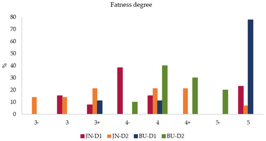 Percentage distribution of fatness degree of Jaca Navarra (JN) and Burguete (BU) foals fattened with two different finishing diets: D1 (Diet 1) = conventional concentrate, D2 (Diet 2) = Silage + organic concentrate.