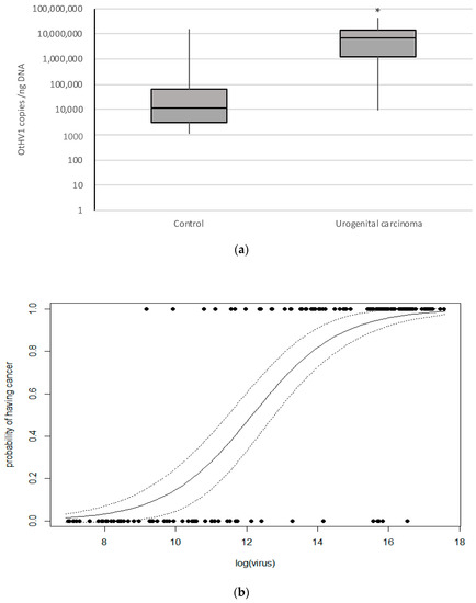 The above graphs show OtHV1 qPCR results from California sea lion cancer and control cases that were qPCR positive for OtHV1. (a) Box plot representing OtHV1 viral copies per nanogram of DNA detected (copies/ng DNA) determined by OtHV1 qPCR, including all OtHV1 positive histologically normal cervix (control; n = 59) and urogenital carcinoma (cancer; n = 95) cases. * = significantly different (p < 0.0001). (b) Binomial general linear model of the probability of having cancer based on the abundance of OtHV1 (log of number of viral copies detected per nanogram of DNA in the reaction) quantified with OtHV1-specific qPCR. Non-cancer cases are on 0.0 and cancer case are on the 1.0 lines.