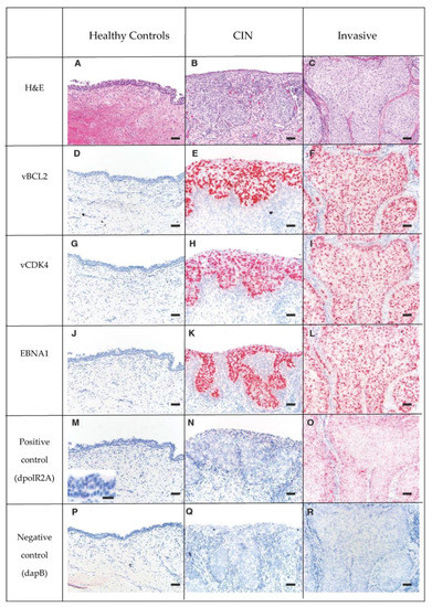 Series of H&E (Row 1: A–C) and RISH (Basescope®) labeled tissue (Rows 2 to 6: D through R), pink dots represent positive hybridization signaling. Rows 2, 3 and 4 are 3 OtHV1 RISH probes (Row 2- vBCL2, Row 3- vCDK4, Row 4-EBNA1). Row 5 is the positive control, California sea lion DNA-dependent RNA polymerase II (dpolR2A). Row 6 is the negative control dihydrodipicolinate reductase (dapB) of Bacillus subtilis. Note that there is no positive hybridization signal of the OtHV1 probes in the normal cervix (D,G,J), and there is a large amount of positive hybridization signaling in both the CIN (Column 2) and invasive (Column 3) lesions from cases with urogenital carcinoma. This shows that there is high OtHV1 mRNA expression in both CIN and invasive cervical tumors, but not in normal cervical epithelium. There was no positive hybridization signal in the negative control (Row 6) for control, CIN or invasive lesions.