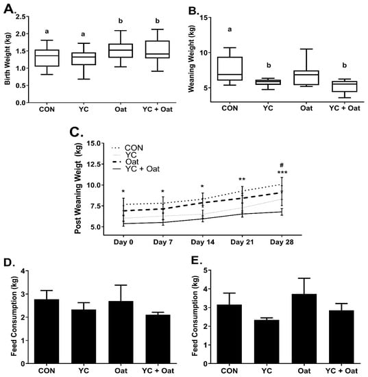 Piglet Weights and Post-Weaning Feed intake. Piglet weights (n = 20) were taken on (A) day of birth and (B) day of weaning. a,b Different letters indicate a significant difference at p < 0.05. (C) Weights starting on day of weaning d0 and including days, 1, 7, 21, and 28 post-weaning. Data are an average of n = 10. Statistical difference between the CON and YC + Oat groups * p < 0.05, ** p < 0.01 *** p < 0.001. (#) Statistical difference between Oat and YC + Oat p < 0.05. Feed intake (D) for first week and (E) second week post-weaning. Data are an average of (n = 4).