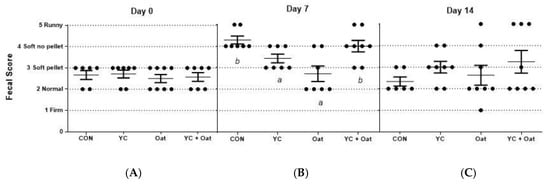 Fecal Scoring. Fecal samples were scored for diarrhea by seven participants blinded to treatments. Each visually scored the fecal matter using the following scoring criteria; (1) firm fecal pellets (2) normal pellets (3) soft pellets (4) soft no pellets but not runny (5) runny. The average scores (A) on day of weaning (day 0), (B), day 7 post-weaning, and (C) day 14 post-weaning are graphed. Data are an average of n = 7. Differences between letters a and b = p < 0.05.