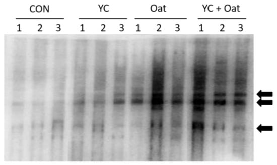 Milk IgG Reactivity. The E. coli specific reactivity of milk IgG was determined after probing resolved and immobilized E. coli extracts with milk collected from sows (n = 3) in each diet group: control (CON), yeast culture (YC), and Oat. Arrows indicate major reactivity with E. coli antigens.