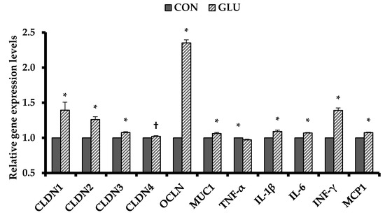 Relative ileal gene expression levels of tight junction proteins and inflammatory cytokines of weaned pigs. Each value is the main value of 6 replicates (1 pig/pen). CON = a typical weaner diet; GLU = CON with 0.5% glutamic acid; CLDN1 = claudin-1; CLDN2 = claudin-2; CLDN3 = claudin-3; CLDN4 = claudin-4; OCLN = occludin; MUC1 = mucin 1; TNF-α = tumor necrosis factor-α; IL-1β = interleukin-1β; IL-6 = interleukin-6; INF-γ = interferon-γ; MCP1 = monocyte chemoattractant protein-1. Data were analyzed by t-test. *,† Different between CON and GLU (*, p < 0.05; †, p < 0.10).