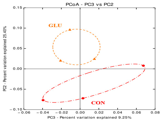 The numbers of sequence reads obtained from weaned pigs were 145,258 and 155,043 for CON and GLU, respectively, after quality filtering, but the alpha diversity indexes, such as OTUs, Chao1, Shannon, and Inverse Simpson, were not different between dietary treatments (Table 8). The PCoA plot for the beta diversity was shown in Figure 2. The distinct separation of microbial populations was visually found between CON and GLU. The taxonomic classification of total bacteria at the phylum and genus levels between dietary treatments are shown in Figure 3. The microbiota of weaned pigs consisted of more than 90% of Firmicutes and Bacteroidetes at the phylum level in both dietary treatments, but there was no difference in microbiota composition at the phylum level between dietary treatments (Figure 3A). At the genus level, the relative abundances of Prevotella and Anaerovibrio were increased (p < 0.05) in weaned pigs fed GLU compared to those fed CON (Figure 3B). However, the relative abundances of Clostridium and Terrisporobacter were lower (p < 0.05) in weaned pigs fed GLU than in those fed CON (Figure 3B).