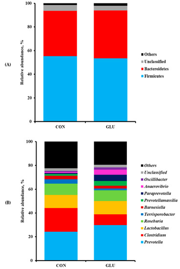 Weaning is a major challenge for piglets to adapt to the GI microbial colonization and physiological changes in their intestine, following the transition of diets from milk to feed as well as other changes. Therefore, the gut microbial analysis was performed as a pilot study using small numbers of animals to assess whether dietary GLU changed microbial population of weaned pigs. Our results showed that the phyla Firmicutes and Bacteroidetes comprised over 90% of all bacteria in the microbiomes of pigs in both CON and GLU. Previous studies reported that both phyla Firmicutes and Bacteroidetes contributed to the production of volatile fatty acids, such as acetate, propionate, and butyrate, through the digestible fiber in plant-derived weaning diets compared with the pre-weaning milk diets [45,46]. In addition, higher proportions of bacteria from both phyla Firmicutes and Bacteroidetes were associated with an increase in BW and these phyla improved the energy production capacity of pigs during the digestion process [47].