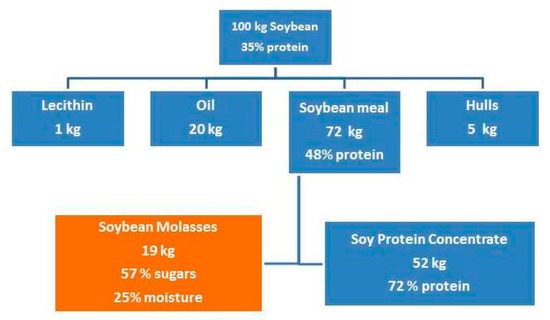 Soy molasses is a brown-colored viscous syrup with a characteristic bittersweet taste [20]. It is obtained from defatted soybeans by the alcohol extraction, and it is a by-product of aqueous alcohol soybean protein concentrate production. After removing the oil from the crushed soybeans, molasses is obtained by the industrial extraction of defatted soybean flakes (white flakes) or soybean meal, by use of warm diluted ethanol (60–70%) or diluted iso-propanol to remove carbohydrates and concentrate the protein. The choice of alcohol type for extraction depends on the availability and prices of extraction liquid. To the best of our knowledge, there is no publication that shows the influence of type of alcohol used for the extraction on nutritional quality of soybean molasses. After extraction, alcohol and some water are removed from the liquid fraction by evaporation, distillation, stripping with steam, elution, column separation, membrane separation, or other techniques. The end product, syrup, or soy molasses is virtually alcohol-free, with the desired moisture content [18,21]. The production of soybean molasses in the industrial processing of soybean is shown in Figure 2.