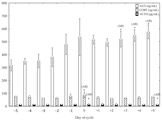 Adrenocorticotrophic hormone (ACTH), cortisol (CORT) and aldosterone (ALD) concentrations (mean ± SD) in cycling mares (n = 23) from day −5 pre-ovulation to day 5 post-ovulation. * Significant differences (A: vs. pre-ovulation days (p < 0.05); B: vs post-ovulation days (p < 0.05)).